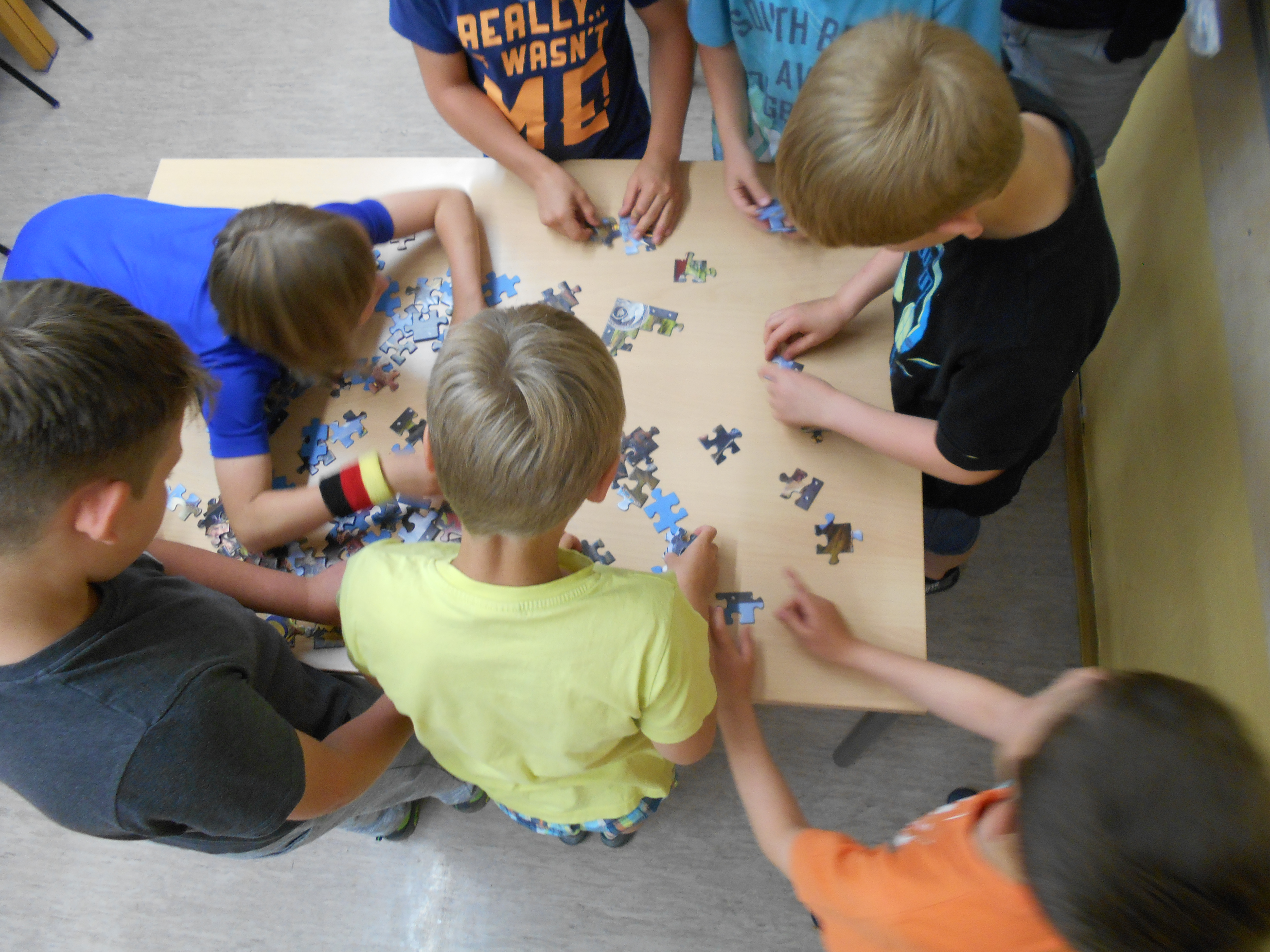 Am späten Nachmittag des 16.6.2017 trafen sich die Kinder der Klasse 3 in der Grundschule zur Lesenacht. Im Klassenzimmer wurden die Isomatten, Schlafsäcke und Bücher für die Nacht zurecht gemacht. Nach dem Abendessen – es gab Pizza vom Lieferdienst – stellte jedes Kind sein mitgebrachtes Buch vor. Alle hörten gespannt zu als kurze Textpassagen vorgelesen wurden. Anschließend begann unsere Schulhausrallye mit Schatzsuche. Aufgaben wie Buchstaben erfühlen und daraus ein Wort bilden, Wettpuzzeln – Jungen gegen Mädchen – , Geschicklichkeitsspiele auf dem Schulhof und Begriffe erraten (Tabu) mussten erfüllt werden. Schließlich konnte der Schatz im Hort geborgen werden. Zum Schluss schauten wir uns den Film „Das fliegende Klassenzimmer“ an. Spät am Abend lagen wir dann auf unseren Matratzen und lasen noch lange mit den Taschenlampen in den Büchern. Die Nacht war schnell vorbei und die Eltern konnten ihre etwas müden Kinder nach einem reichhaltigem Frühstück wieder abholen. Es hat allen sehr gut gefallen und wir hatten viel Spaß miteinander.